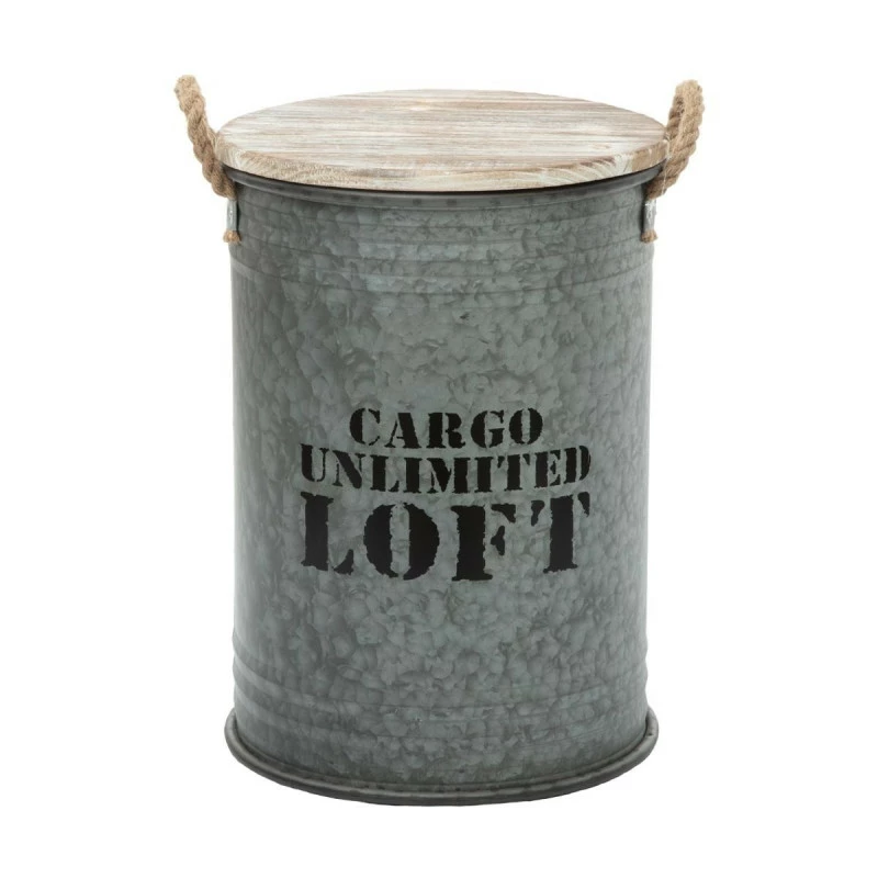 Lot de 3 coffres en formes de bidons gris métallisé de la marque Atmosphera. Adopter un style industriel grâce à ces bidons Loft avec leur plateau en sapin et leurs poignées en chanvre.