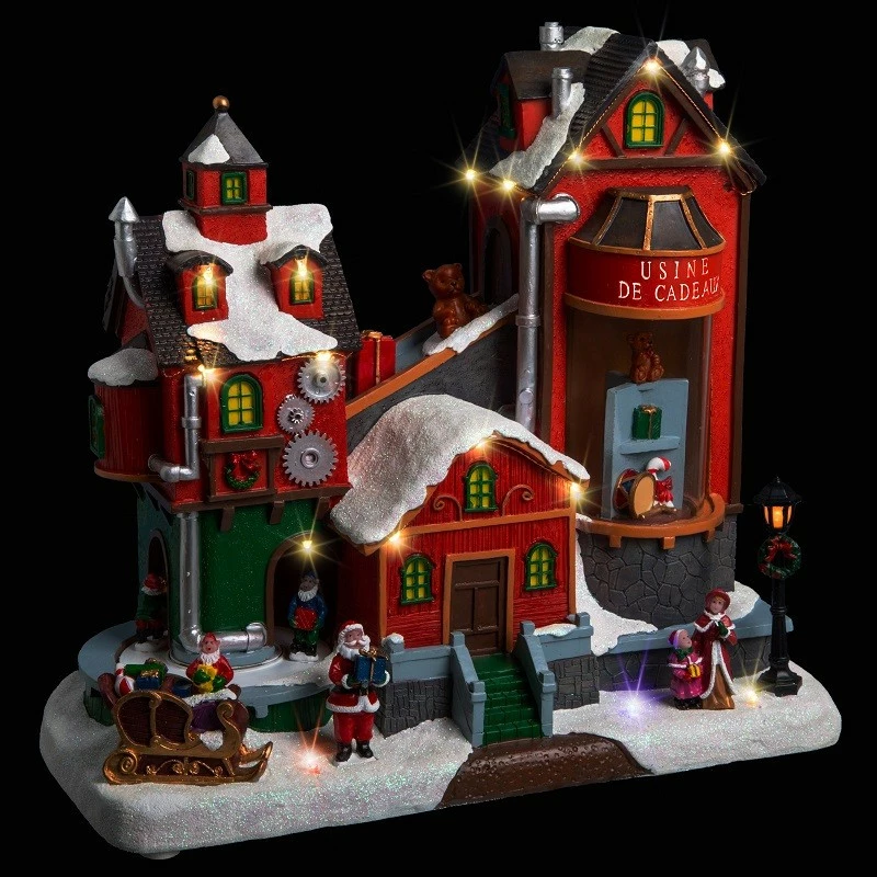 Village composé d’une usine en 3 bâtiments + passerelle sur laquelle glissent des cadeaux + vitrine tournante + lutins qui tournent sous un bâtiment.