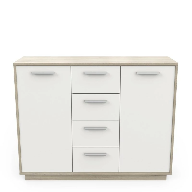 Avec son style épuré, le buffet bas 2 portes 4 tiroirs Léo s’intègre facilement dans un intérieur.