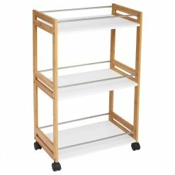 Ranger, desservir la table et mettre une touche de modernité dans la cuisine, voila tout ce que permet de faire cette desserte grand modèle bambou. Équipée d’un plateau supérieur + 2 tablettes inférieures. Montée sur roulettes. Desserte en bambou, inox, panneaux de particules et plastique.