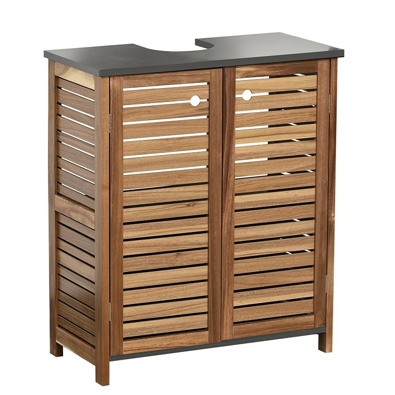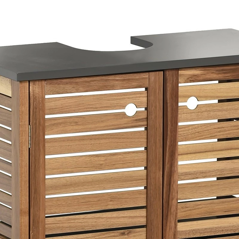 Ce meuble sous lavabo en acacia et MDF dispose d’une étagère intérieure ainsi que d’un porte serviettes intégré sur le côté.