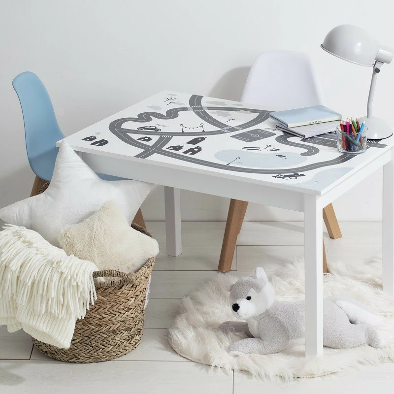 Plateau décoré avec un plan d’une ville avec un circuit pour voitures.