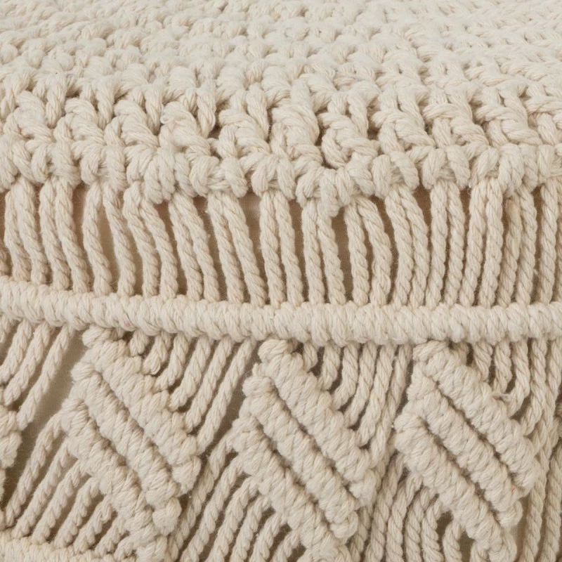 Vendu à l’unité. Assise en mousse recouverte et décorée d’un tissu au style macramé avec franges.