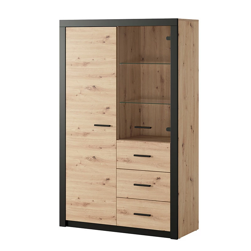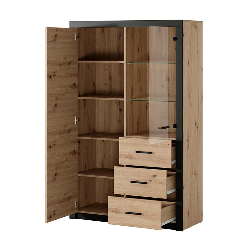 La vitrine dispose d’une porte pleine avec 5 étagères intérieures et d’une porte vitrée avec 2 étagères intérieures vitrées.